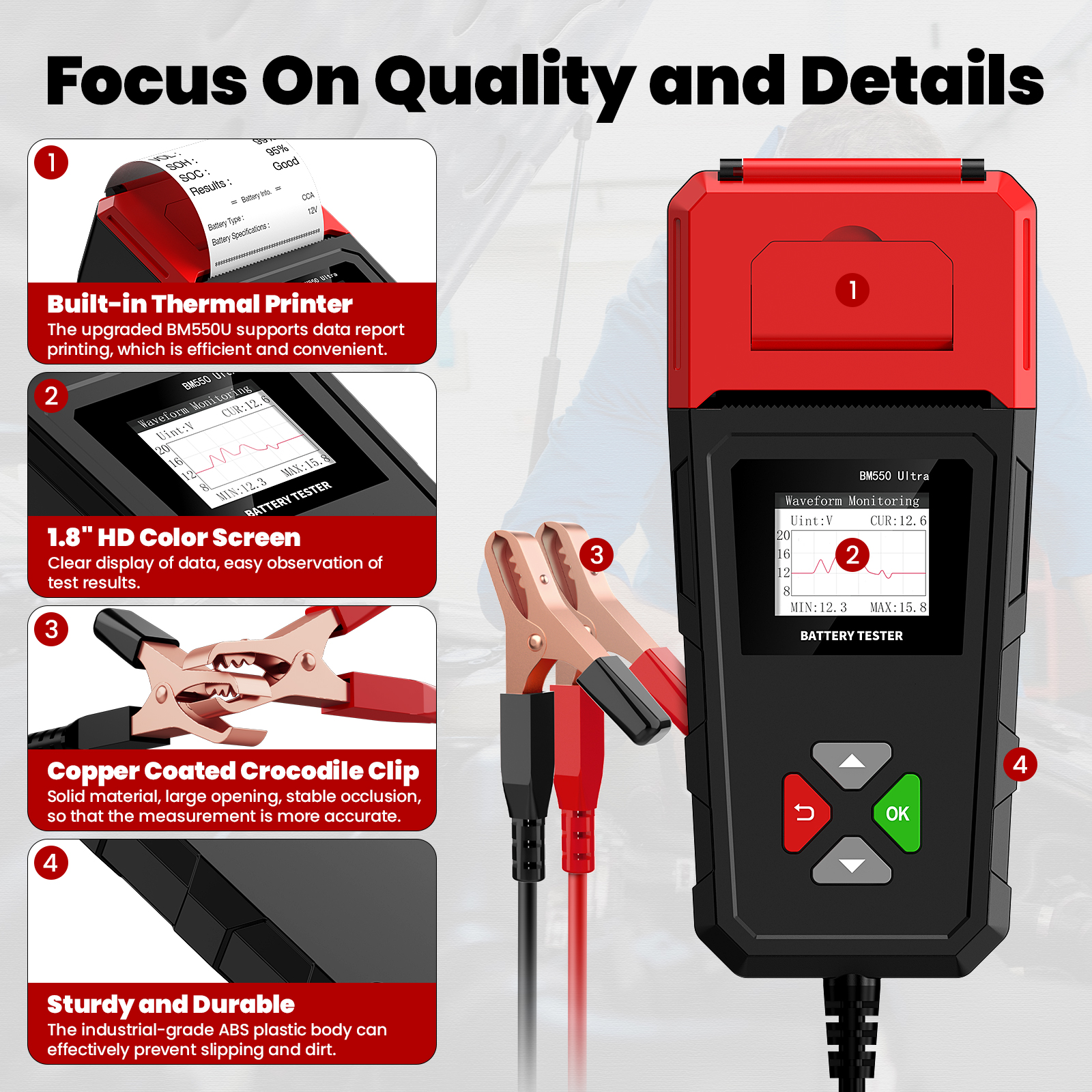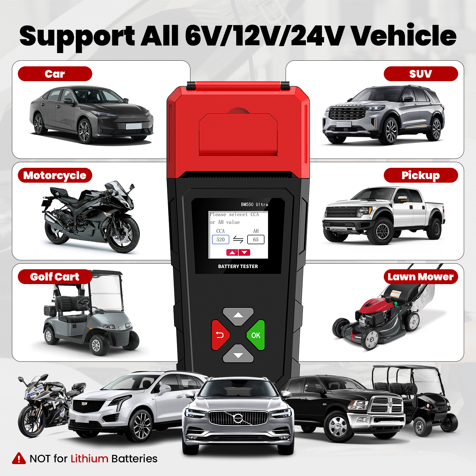 It can test all 6V/12V/24V batteries with 100-2000CCA, including regular lead-acid batteries, AGM flat plates, AGM, or gel batteries, and is equipped with a printer to print test results.